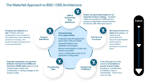In the early 2000’s the concept of catalog-driven applications began to emerge as a more formal way to deal with disparate data sources that easily fell out of sync with one-another. The premise was that if data was centralized (or mastered) in a specific location, changes to that data could be more easily pushed out to BSS and OSS systems, resulting in improved time-to-market and a reduction in fallout.
